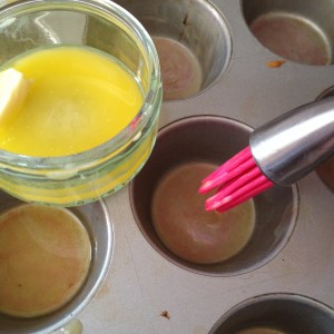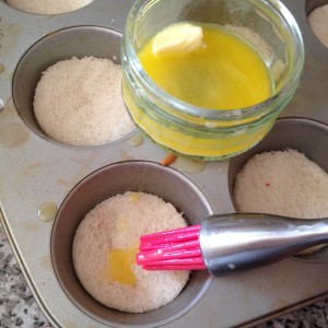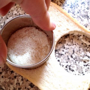 Flatten your bread a little with a rolling pin and use a metal round cookie cutter to cut out circles of bread. Push these into your greased tin.