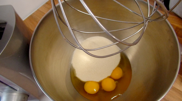 Whisk together the eggs and sugars until they have tripled in size.