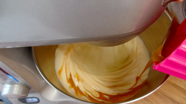 Pour in the melted butter and chocolate and then the caramel. Mix well.