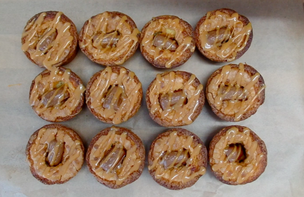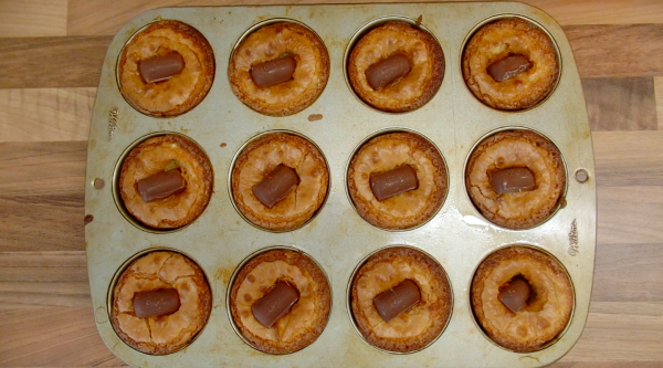 Take out of the oven and push in Cadbury’s Caramel segments into each cup. Pop back in the oven and bake for another 5 minutes.