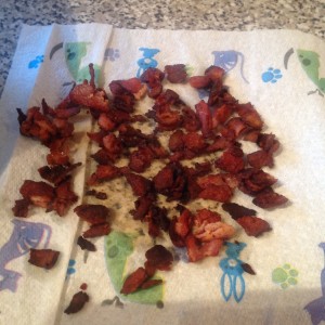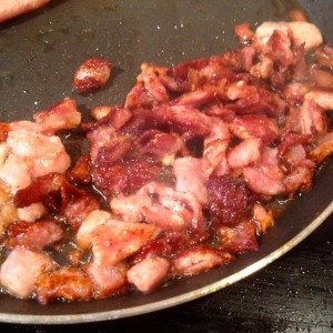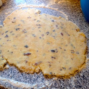 Then add in your fried bacon and egg yolks. Add in a splash of milk until your dough becomes workable.