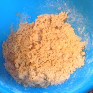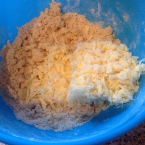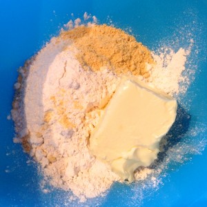 Time to get our hands dirty! Crumble together the flour, mustard powder and butter to make a loose breadcrumb consistency.